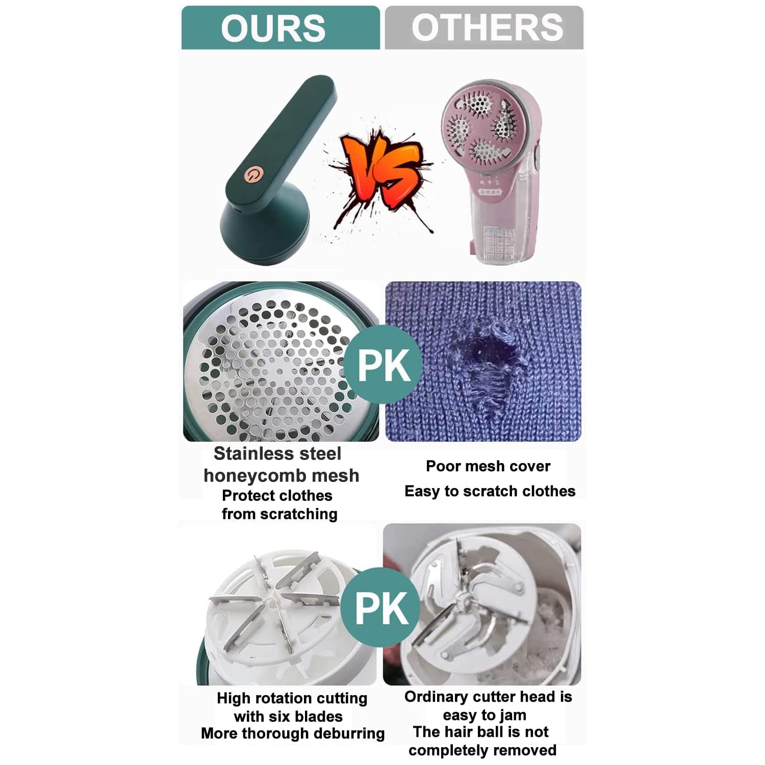 ✅SAFE WORK WAY - Rechargeable fluff shaver detachable bionic honeycomb blade mesh protects fabrics from damage. The fabric shaver instantly removes and collects excess fluff from clothing. The fabric shaver has a guard with a stainless-steel mesh that bends slightly to fit snugly over clothing. Will not damage the fabric or your hands.